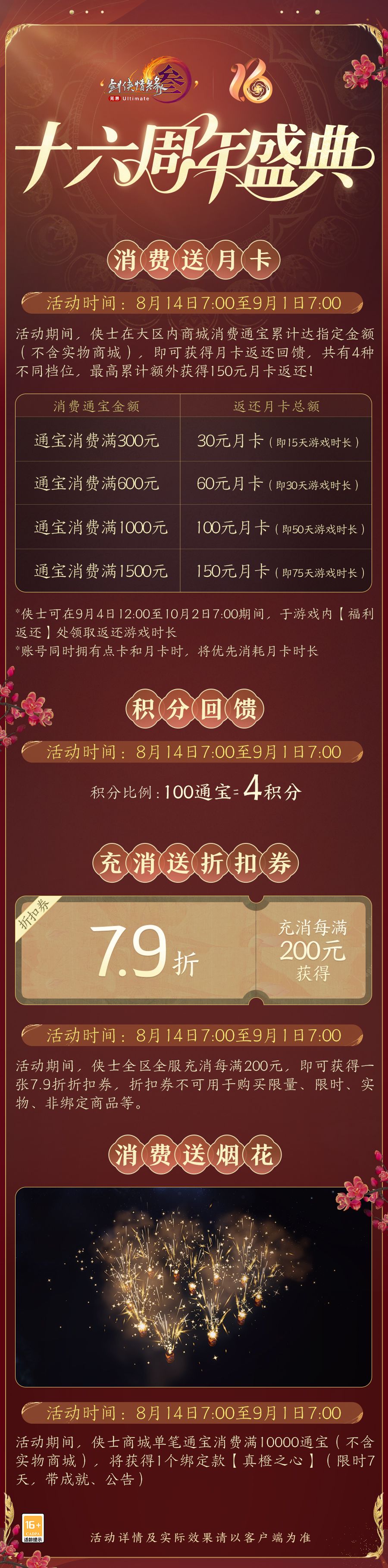 十六载江湖路,幸与诸君常相伴,为酬新朋旧友齐欢聚,周年盛典多重活动即将开启!四倍积分、消费送月卡和精美烟花,多项惊喜活动等你来参与!