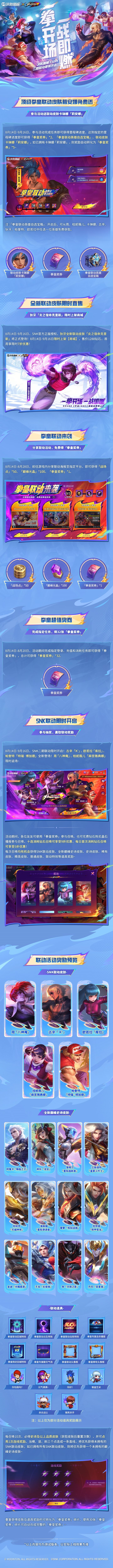 SNK官方正版授权,决胜巅峰×SNK二期联动8月14日正式开启!全新联动活动即将上线,参与活动即可免费获取卡琳娜联动皮肤「莉安娜」,还有全新联动皮肤、战场播报、回城特效、击败特效等诸多联动道具等你带走~