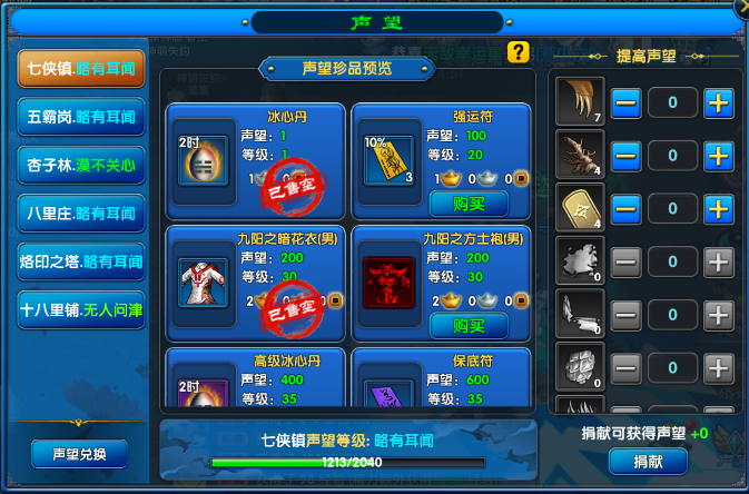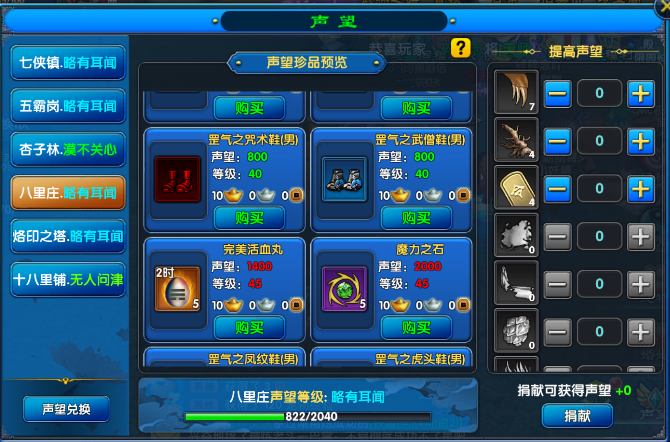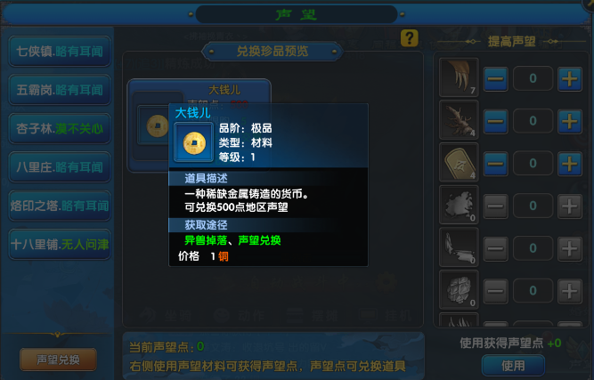 声望的定义与作用声望在游戏中有着重要作用,它关联着游戏内 6 个主城的声望商店,像七侠镇、十八里铺、京城等,每个商店都独立计算声望值。玩家积累声望值,当达到商品要求,同时角色等级达标且拥有足够铜钱或元宝时,就能在商店兑换物品。