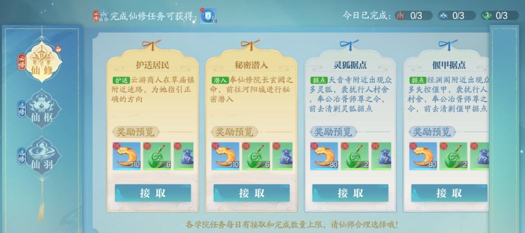 每天仙社里的学院任务最好都清完,三个学院一共九个任务,完成任务可获得对应学院经验。