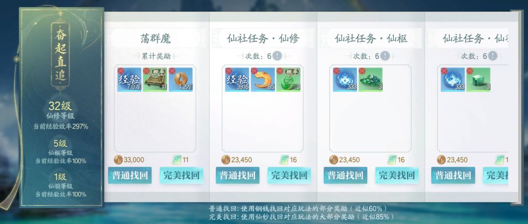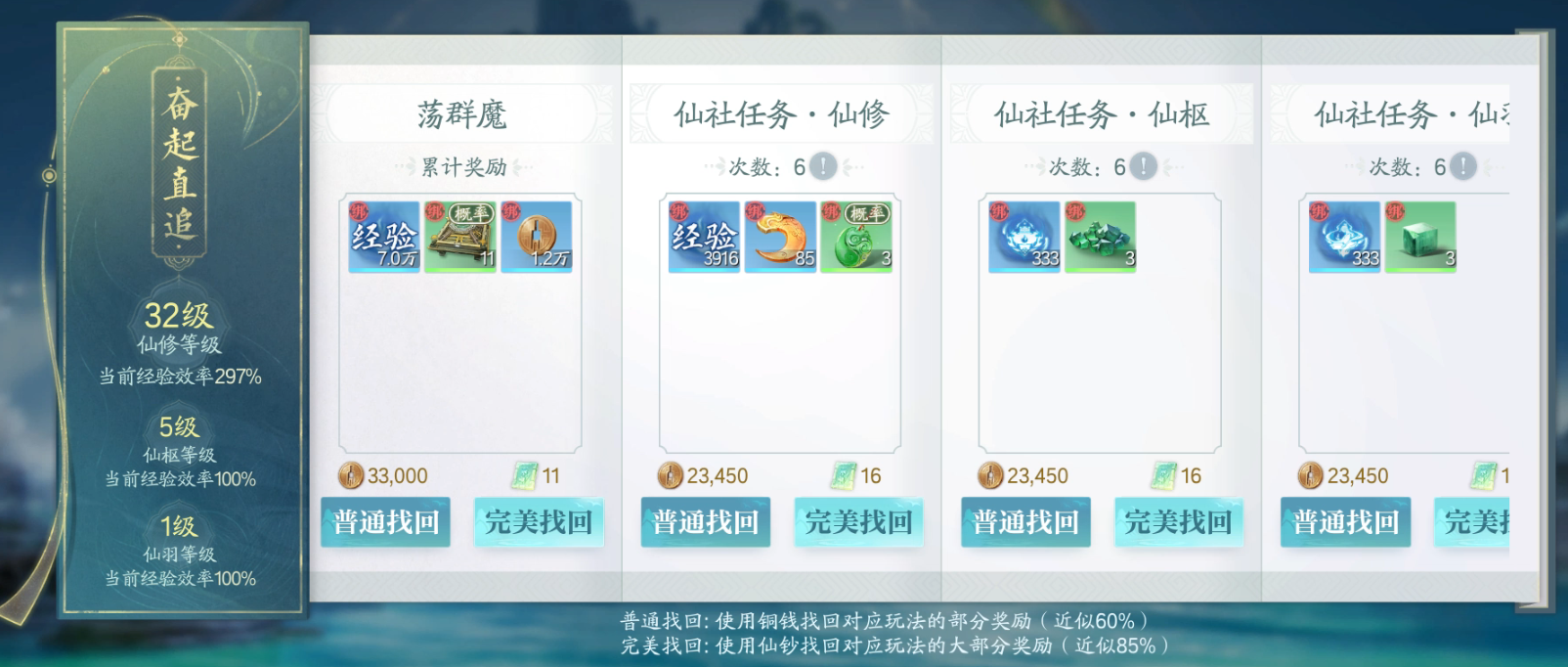 如果实在很忙没有做任务,咱们可以来到境界修炼界面,找到右下方资源找回,能看见咱们丢失的经验都在这里了,最多能累计七天。普通只能找回百分之六十,消耗铜钱;完美找回百分之八十五,消耗仙钞,根据自己的需求选择性找回即可。