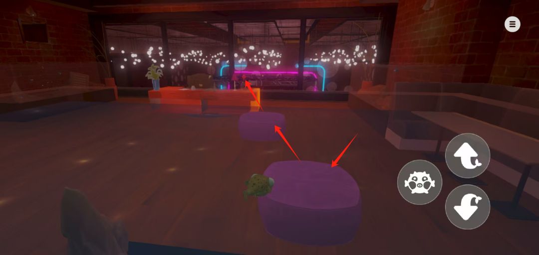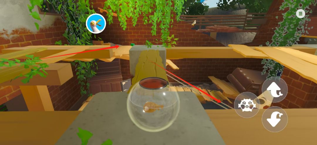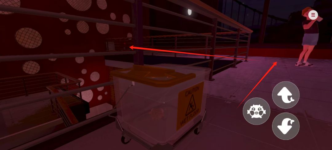 这里鱼缸上面有个网,可以用技能从底下往上弹,第一次破网,第二次出去。然后箭头标记处有个大爷在拖地,又有我们最爱的水车了,跳出去后经过沙发进入水车即可。