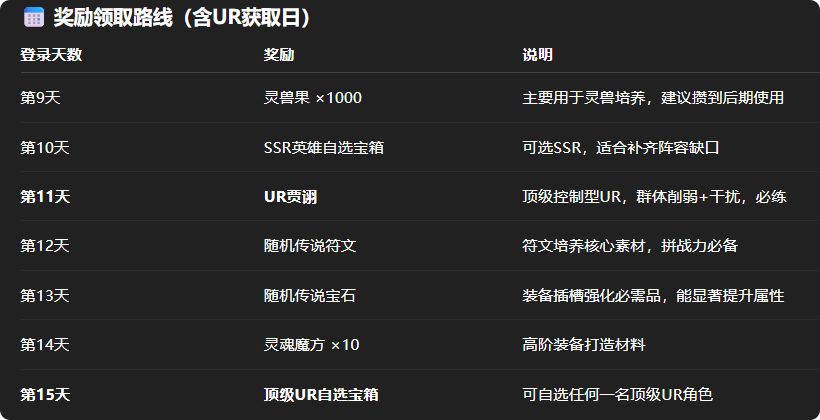 本次活动相当于直接送两名UR(一个固定,一个自选)+其他途径两名UR,总计四个顶级UR,零氪玩家也能轻松集齐,极大提升阵容上限。只要每天稳定登录,坚持到第15天,你的战力就能实现质的飞跃!