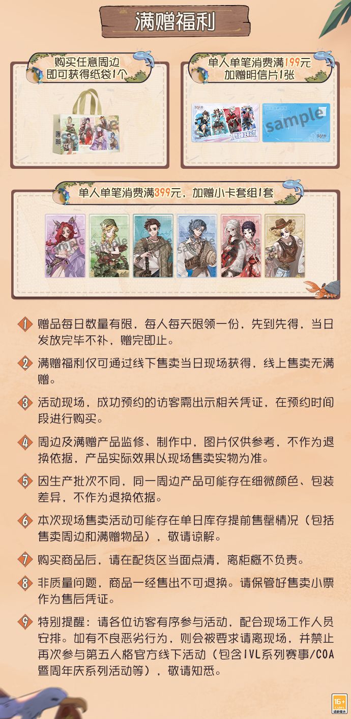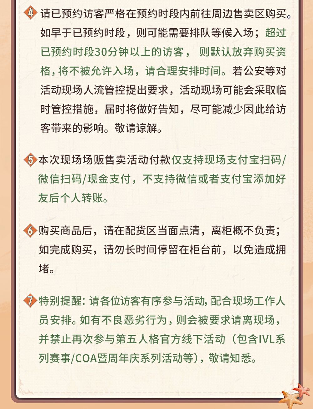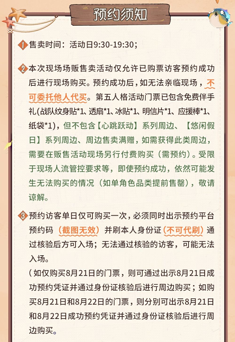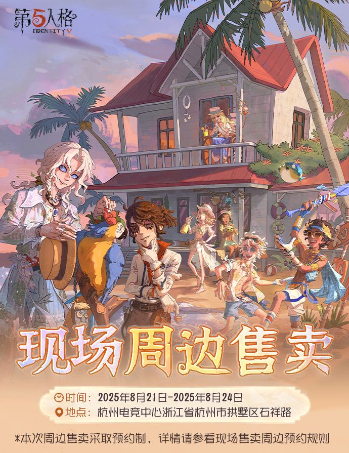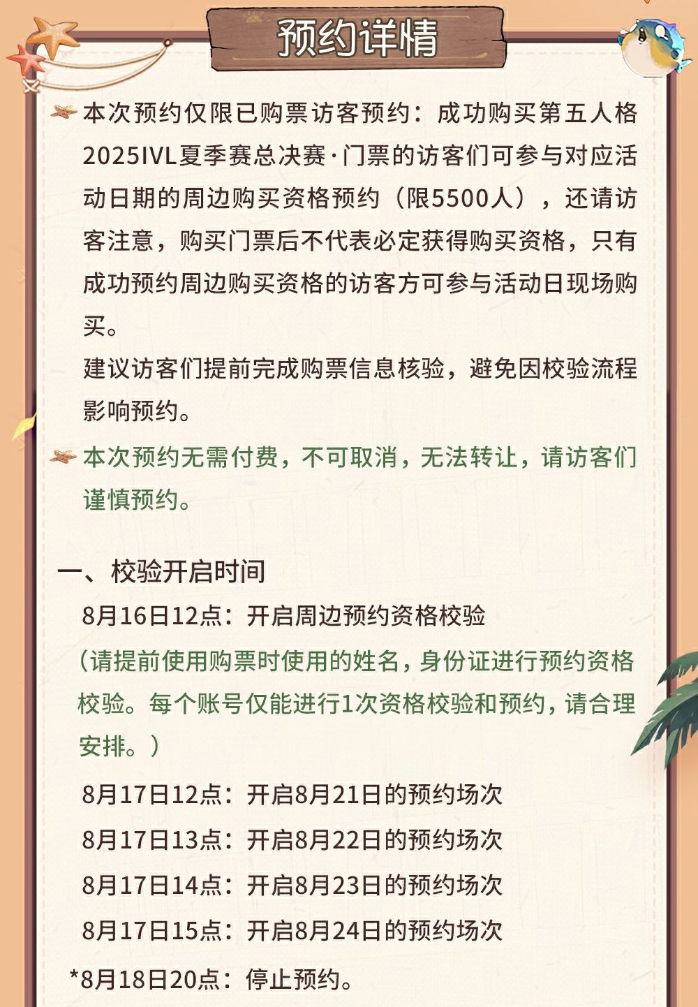 本次现场周边售卖活动采用预约制,成功购买第五人格2025IVL夏季赛总决赛·门票的访客们可参与8月17开启的对应活动日期的周边购买资格预约(限5500人),还请访客注意,购买门票后不代表必定获得购买资格,只有成功预约周边购买资格的访客方可参与活动日现场购买。