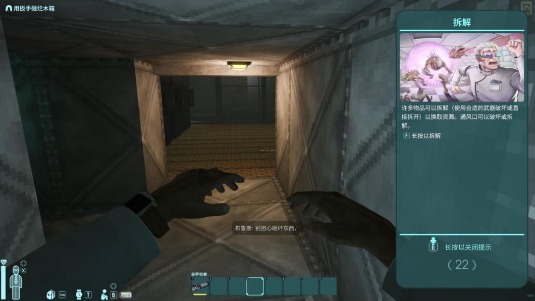 因为游戏的背景的被设定在地下实验室,所以想要制作各种装备道具就要有资源的获取,所以本作只要拿着工具,就能拆解周围的乙炔物品,都会获得对应的资源,比如拆解桌子就会获得木材和桌腿,拆电子物品就会获得他们的电子零件,电源模组、风扇这些。