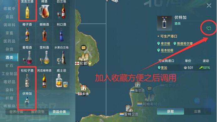 2.**玩家陆续到达120级,舰船的帆力、扛浪、货仓也随之提升。在入手加勒比入港证后,玩家开始寻求更高效的商路。那让我们聚焦加勒比,开启本期的贸易路线——北海新派酒类对拉航线"子龙对拉"与"伏龙对拉"。现在,请大家跟随我的指引:打开右上角的小地图,在货品分类中找到三种交易品——伏特加、杜松子酒、龙舌兰酒,并将它们添加至收藏。**