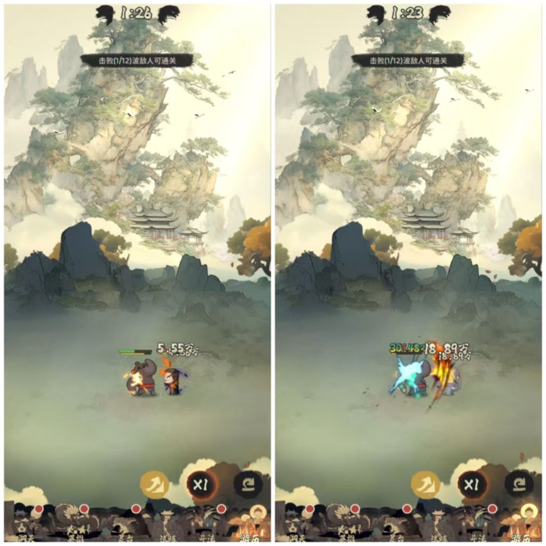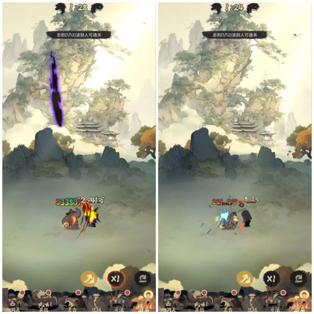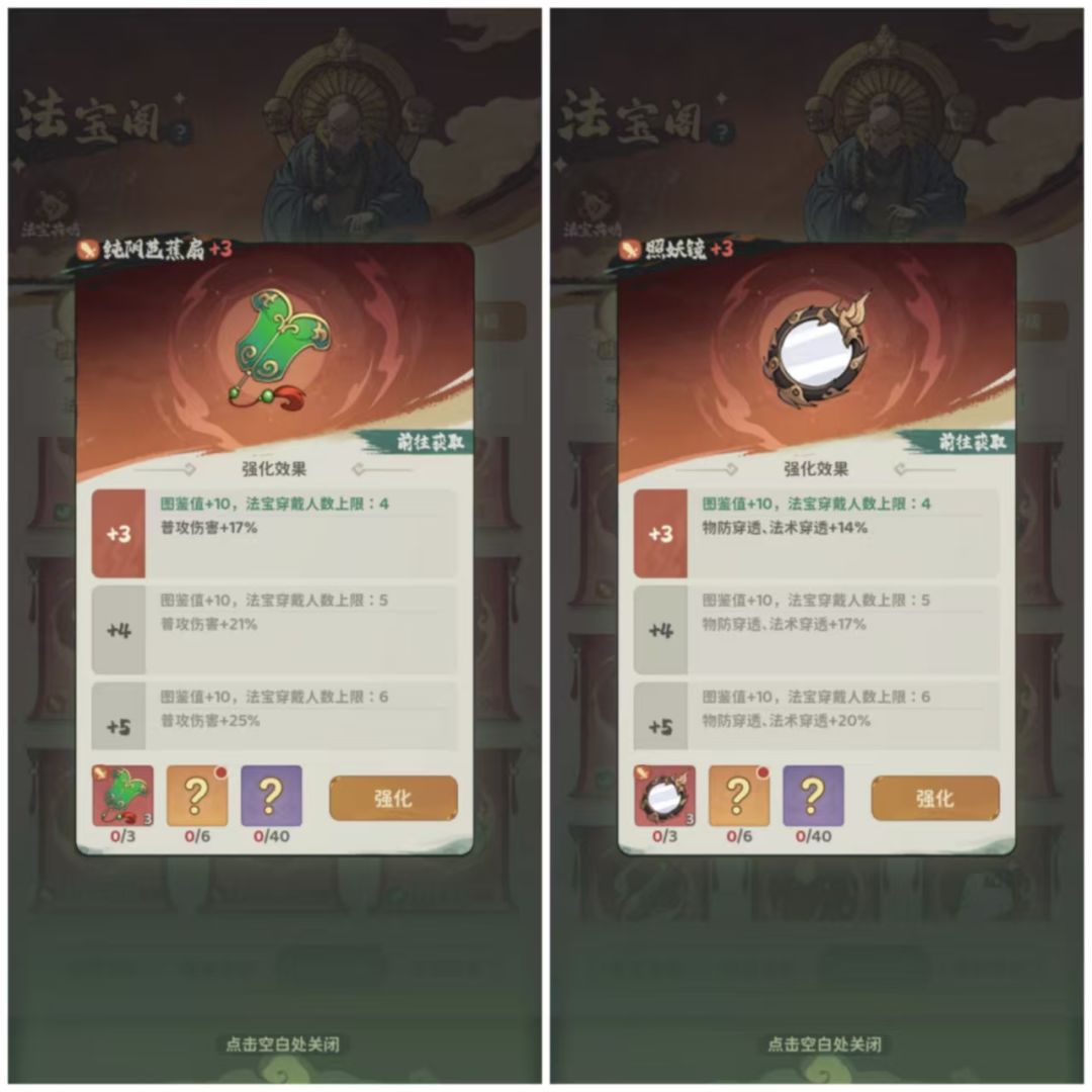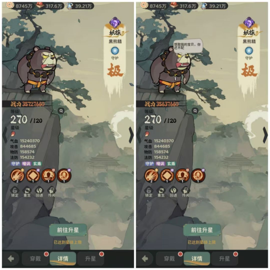 可以看到左侧佩戴纯阴芭蕉扇后的普攻伤害为2.36+2.7万,怒气伤害不变仍为8.2万。普攻伤害较白板状态的黑熊精增加11.8%和12.0%,较纯阴芭蕉扇面板数据少5%,对比风铎的效果,目前原因不明,有待探索。怒气伤害完全不变,再次说明佩戴绝品法宝不影响基础数据,多出来的战力较虚,不能代表实际对战情况,这也是游戏中能够越战力击败高战的原因之一,由此可见选择法宝佩戴的重要性。