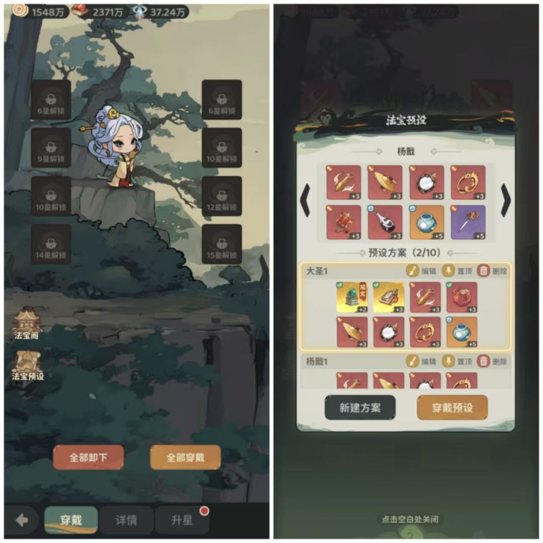 随着英雄星级提升,可佩戴法宝数量也增加,6星可以解锁两个法宝穿戴槽位,15星全部解锁最多可以佩戴8个法宝,槽位解锁后可以佩戴任意等级法宝,包括圣品法宝。右侧为法宝预设,因为可以穿戴8个法宝,法宝种类琳琅满目,适应不同英雄不同战斗场合各种组合较多,故而可以采用预设的形式固定几个穿戴方案,方便一键穿戴。