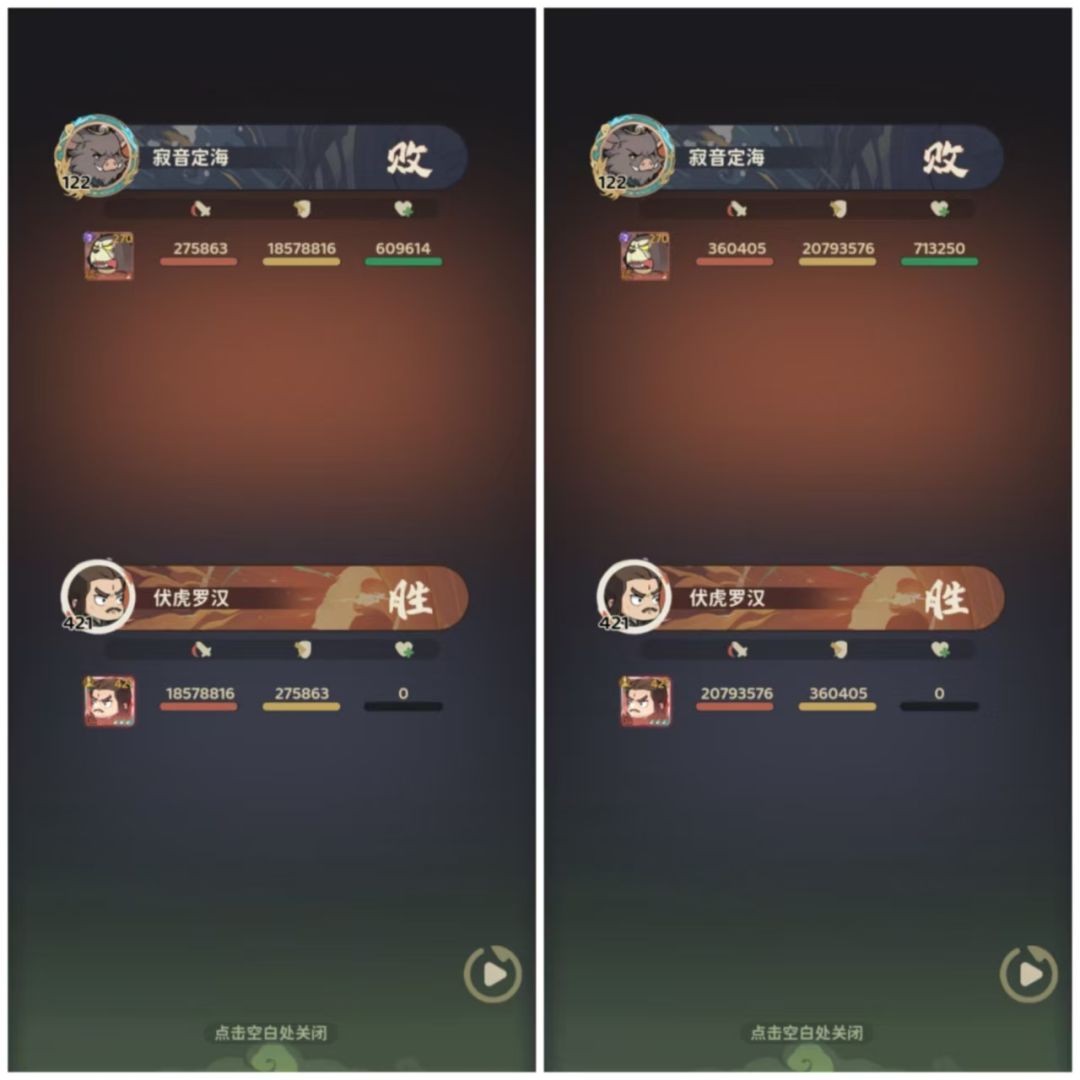 鱼篮增加的血量同样在面板共看不到,但在战斗结算画面可以侧面看出,黑熊精佩戴前伏虎罗汉最终伤害为1857万,佩戴鱼烂后为2079万,增加12%血量,较面板数据少5%。