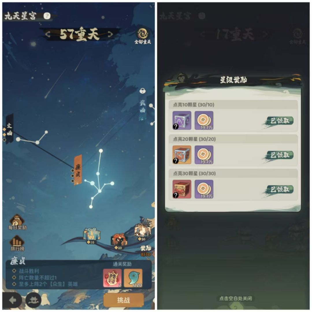 值得注意的是九天星宫17重天开始,点亮30颗星的星级奖励可以获得一个随机绝品法宝箱子。17重天想要满星大概实际进度要推到30重天回来补星比较容易。圣品法宝目前来源渠道很少,有活动一定要抓住机会获取,尤其是限定圣品法宝。
