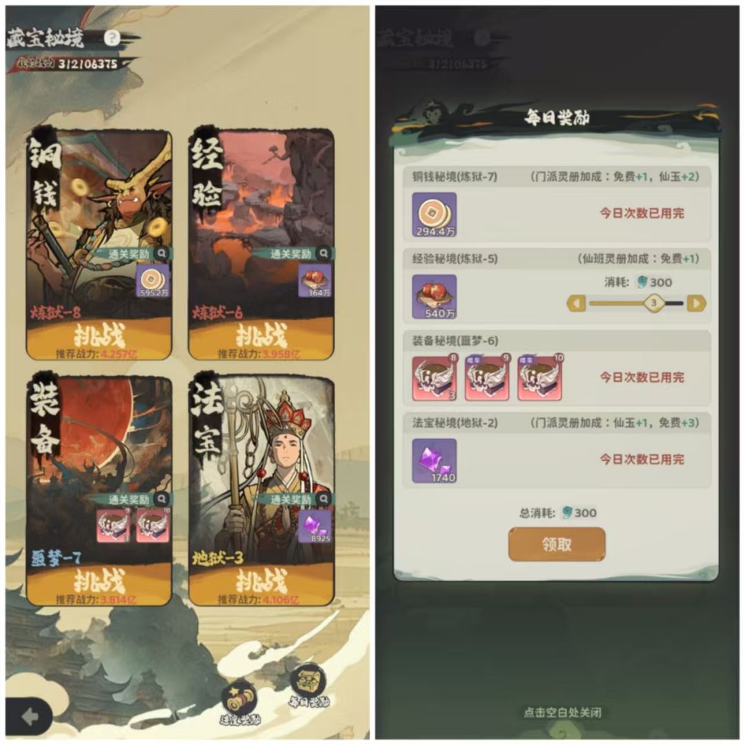 途径一:挑战法宝秘境可以获得大量法宝碎片,每日还可以花费玉来领取法宝碎片,玉充足的情况下一般都要每天拉满。