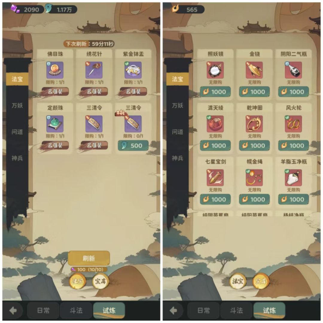 每次天尊宝库抽取一次可以获得1个造化道玉,能够在右侧宝库中换区绝品及一下法宝,建议这里攒着换绝品法宝。左侧法宝界面每2小时积累一次免费刷新次数,可以使用法宝残片和玉购买法宝,每次刷新6个,5个使用残片购买剩下一个只能使用玉购买,一般建议不要浪费玉,只使用残片购买。随着等级提升,该界面能够刷出更高级别-绝品法宝,目前没见过刷出来圣品法宝的,圣品法宝一般只能在活动中获得。下面介绍法宝残片获取的集中途径。