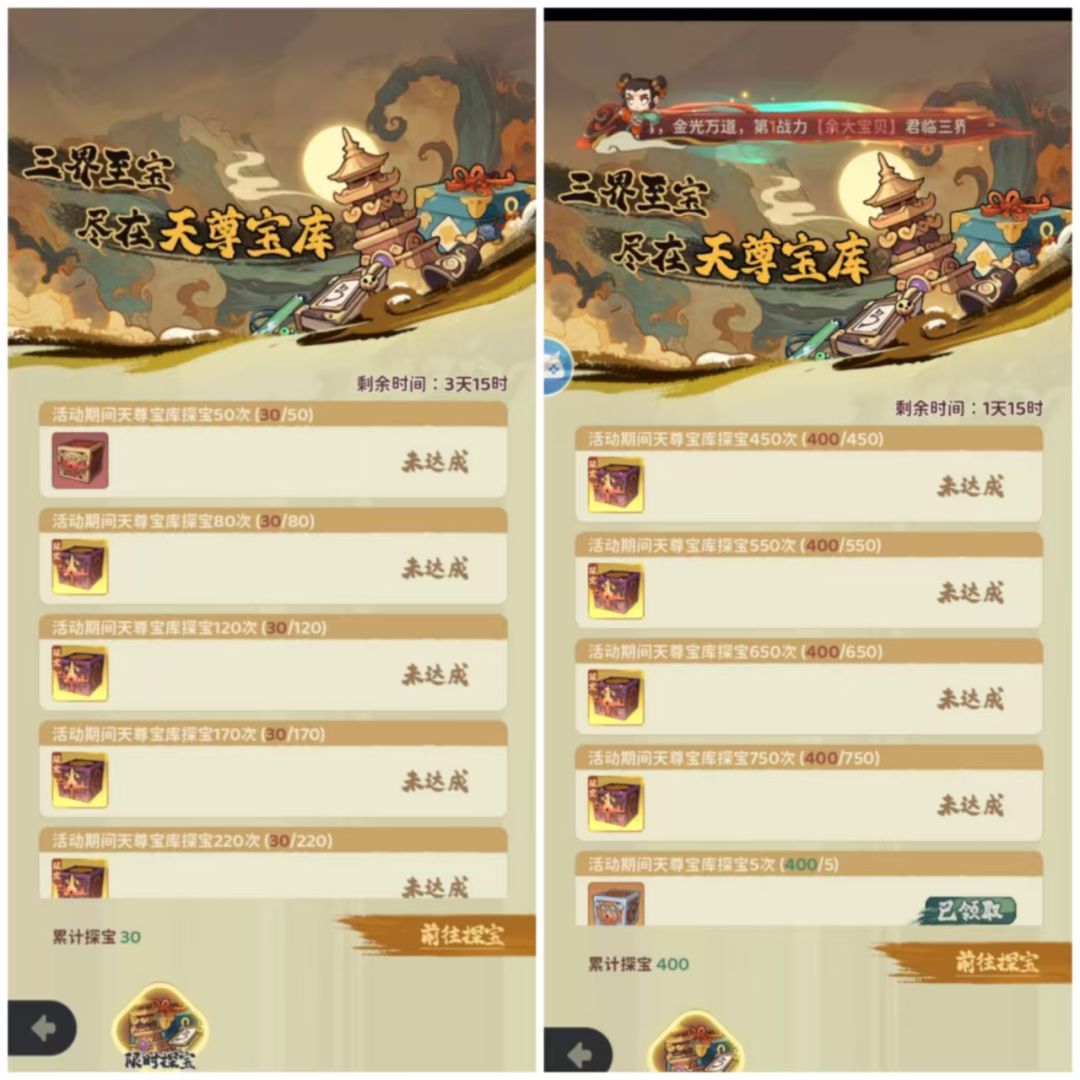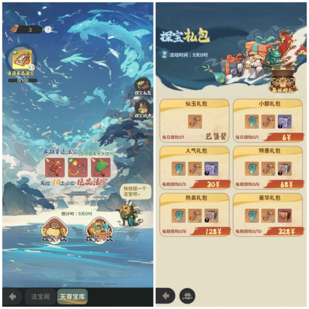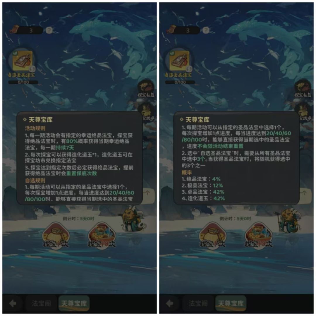这里可以使用道具抽取法宝,能够获得绝品法宝(每期3种绝品法宝,30次保底出货)和极品法宝(左上角累计次数获得,首次为20),探宝礼包每日可以免费领取1个,300玉购买2个,每10天可免费获得一个绝品法宝。