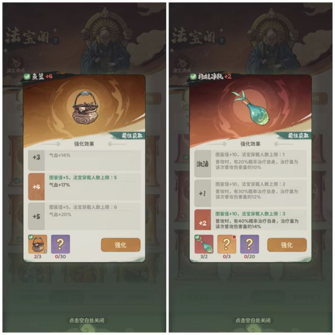 鱼篮增加气血17%,杨枝净瓶普攻时有40%概率治疗自身,治疗量为普攻伤害的14%。