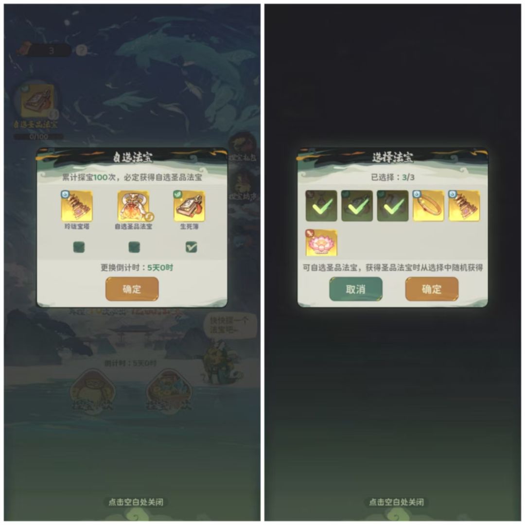 勾选后,抽取次数到达要求后直接获得勾选的极品法宝。需要说明的是中间的名字虽为自选法宝,实际为从右侧6个法宝中随机获得。