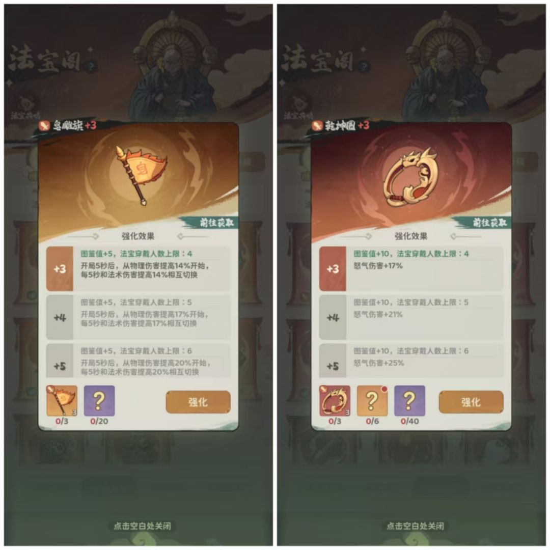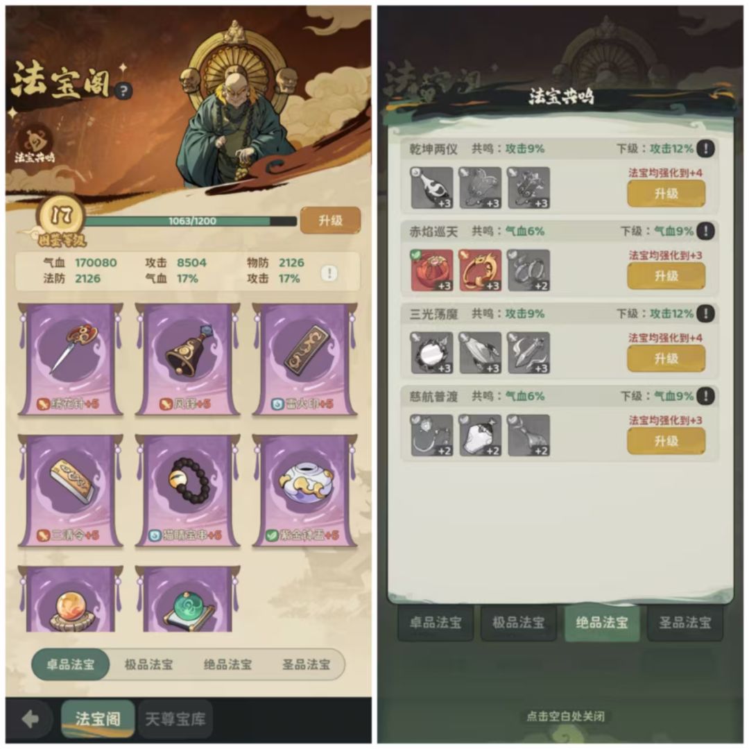 这里可以看到法宝按照品质高低分为四种,最初级为紫色卓品法宝,共计8个,主要影响佩戴英雄基础属性和抗暴之类的属性;其次为黄色圣品法宝,部分提供基础属性血量、法防物防等,有部分可以开始提供一些独特技能,比如白玉盂(受到怒气伤害时,获得该次伤害百分比的护盾);之后为红色绝品法宝,一些法宝都能够提供更独特技能,比如幌金绳概率使对面无法复活;最后是圣品法宝,提供的技能绝大部分都很强力,比如生死簿提供初始怒气、番天印提升回怒效率。图鉴等级能够提供基础数值提升,增加攻击气血百分比,卓品、极品、绝品和圣品法宝分别在激活和升级时提供1点、5点、10点和20点图鉴值。右侧为法宝共鸣界面,卓品极品激活法宝共鸣提供具体数值增幅,绝品和圣品激活后提供百分比加成,大家升级法宝时除了提升强力法宝的等级,也要尽量考虑激活升级法宝共鸣,尤其是绝品和极品共鸣能够提供不少战力。