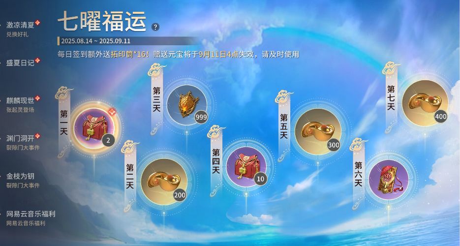 活动期间内,每日上线签到领取奖励,第七日可以直接领取400限时元宝!七日签到累计共900限时元宝免费领取。