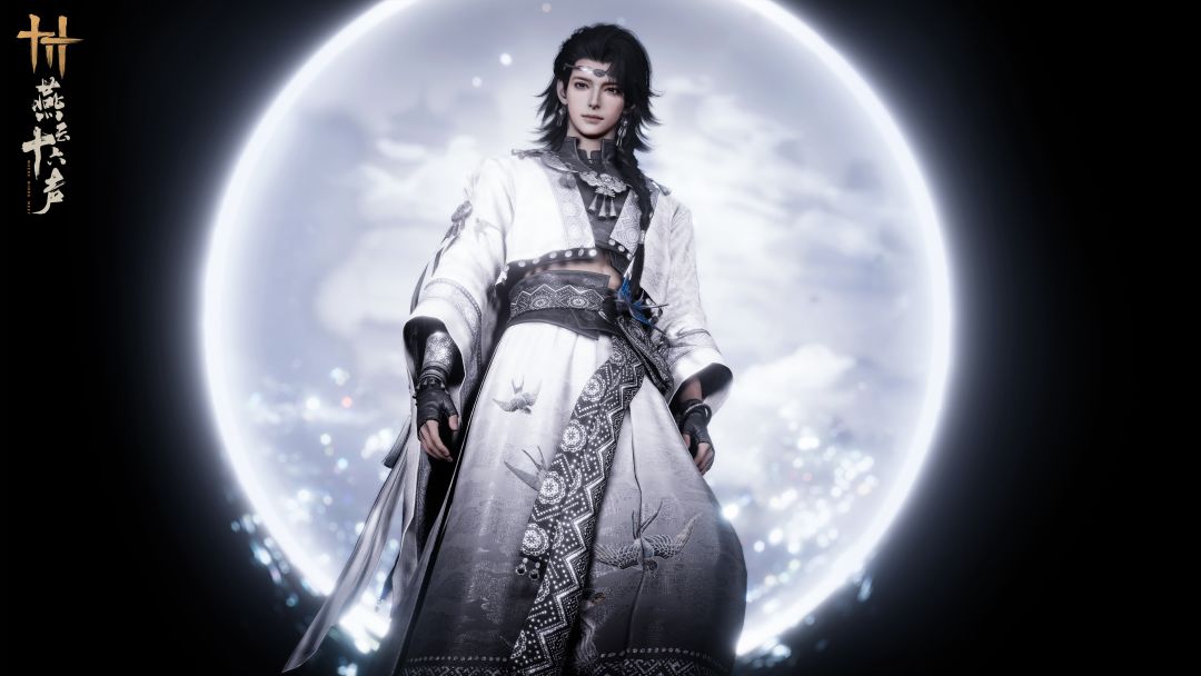 衣袍以白黑为主色,外袍如月光倾泻,图腾纹饰点缀其间,更有墨色飞鸟振翅欲飞,栩栩如生。月光扫过,方见银漪般的典雅暗纹,倒似半卷未展的书画,只待有心人看破那一绢千工的玄机。