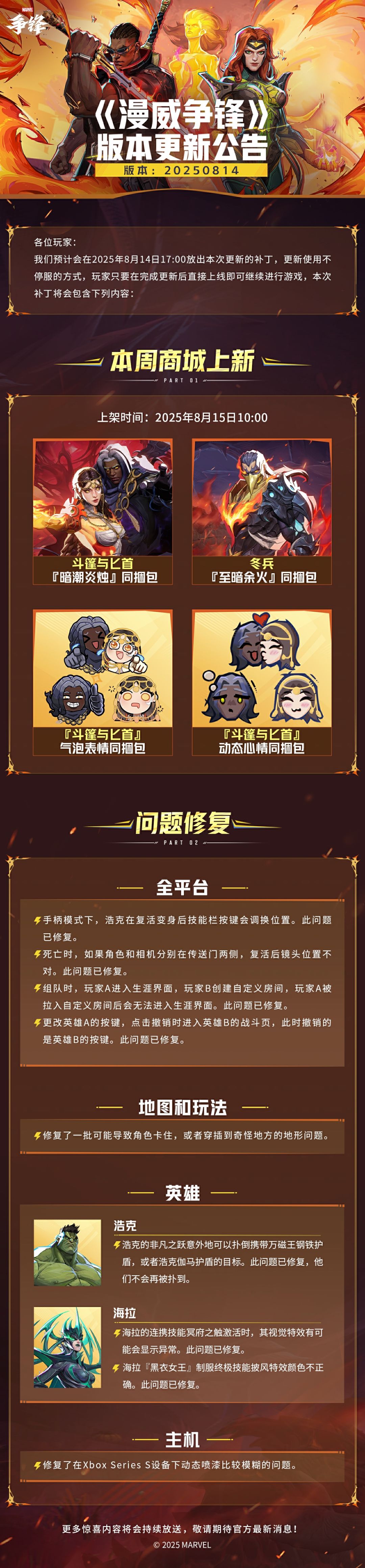 我们预计会在2025年8月14日17:00放出本次更新的补丁,更新使用不停服的方式,玩家只要在完成更新后直接上线即可继续进行游戏,本次补丁将会包含下列内容: