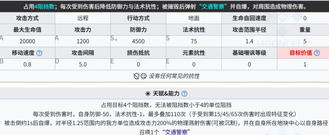 这玩意也别想着挡了,初始4500甲75抗(上次合约大盾4000甲90抗)大家也该知道用什么干员处理了。所谓受到一次伤害防御降低我只能说。。50/4500和1/75比不出来那也别比了。相对应的这次物理伤害面对它时也有机会输出。
