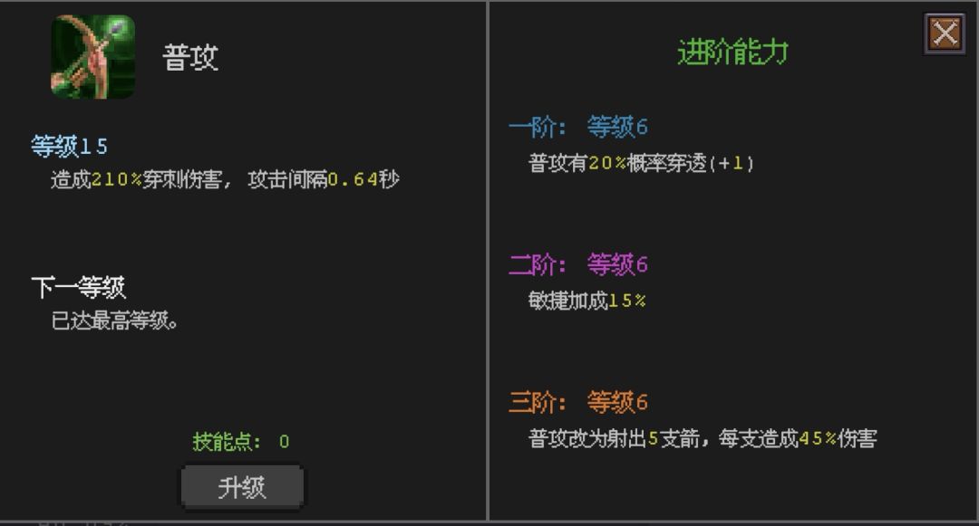 从上图我们可以看到,神鹰的普攻自带20%穿透(弹道能够穿透怪物)以及更厉害的三阶能力,一次普攻改为射出5支箭矢并且每支造成普攻伤害的45%,通过上图我们可以发现15级的普攻造成210%的穿刺属性伤害。