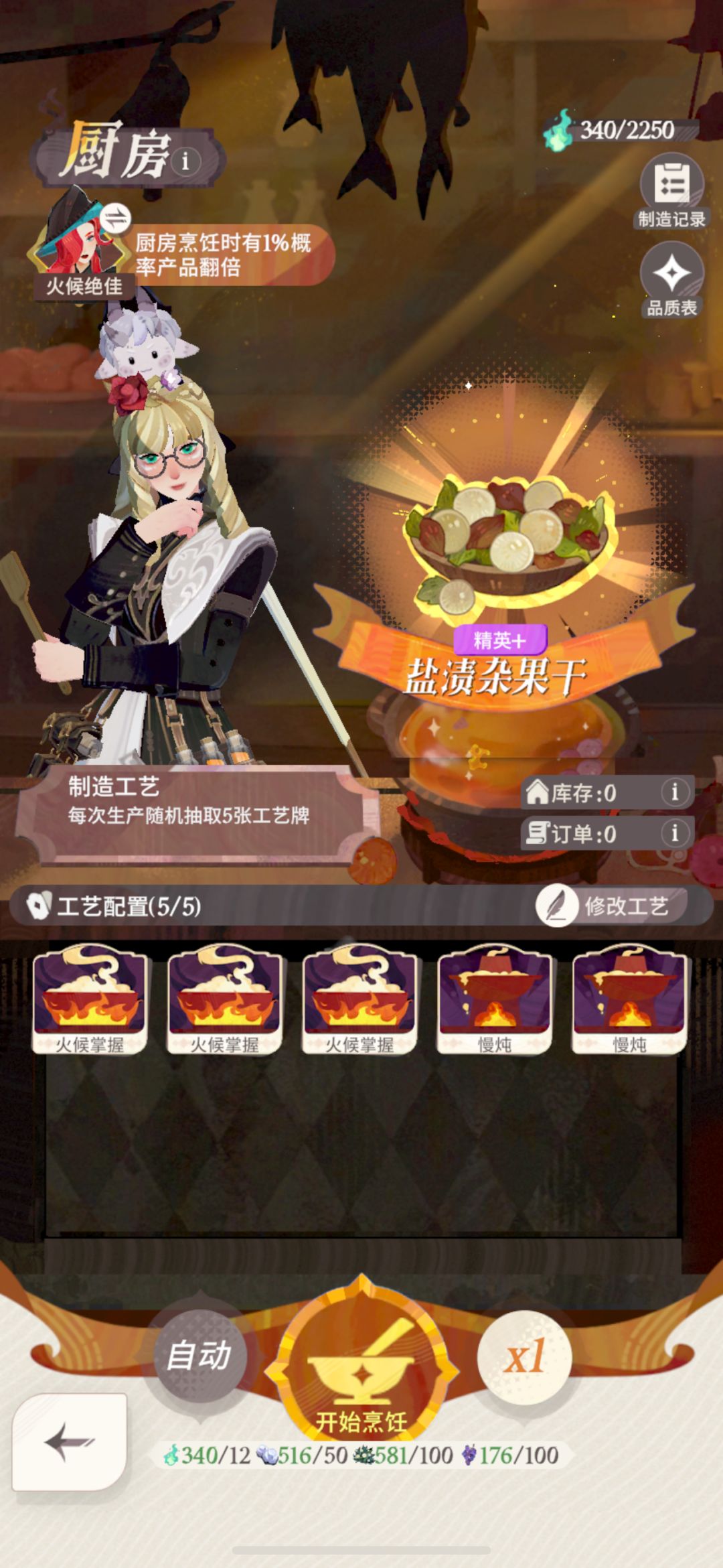 【厨房】1星【盐渍杂果干】,配方【火候掌握,火候掌握,火候掌握,慢炖,慢炖】