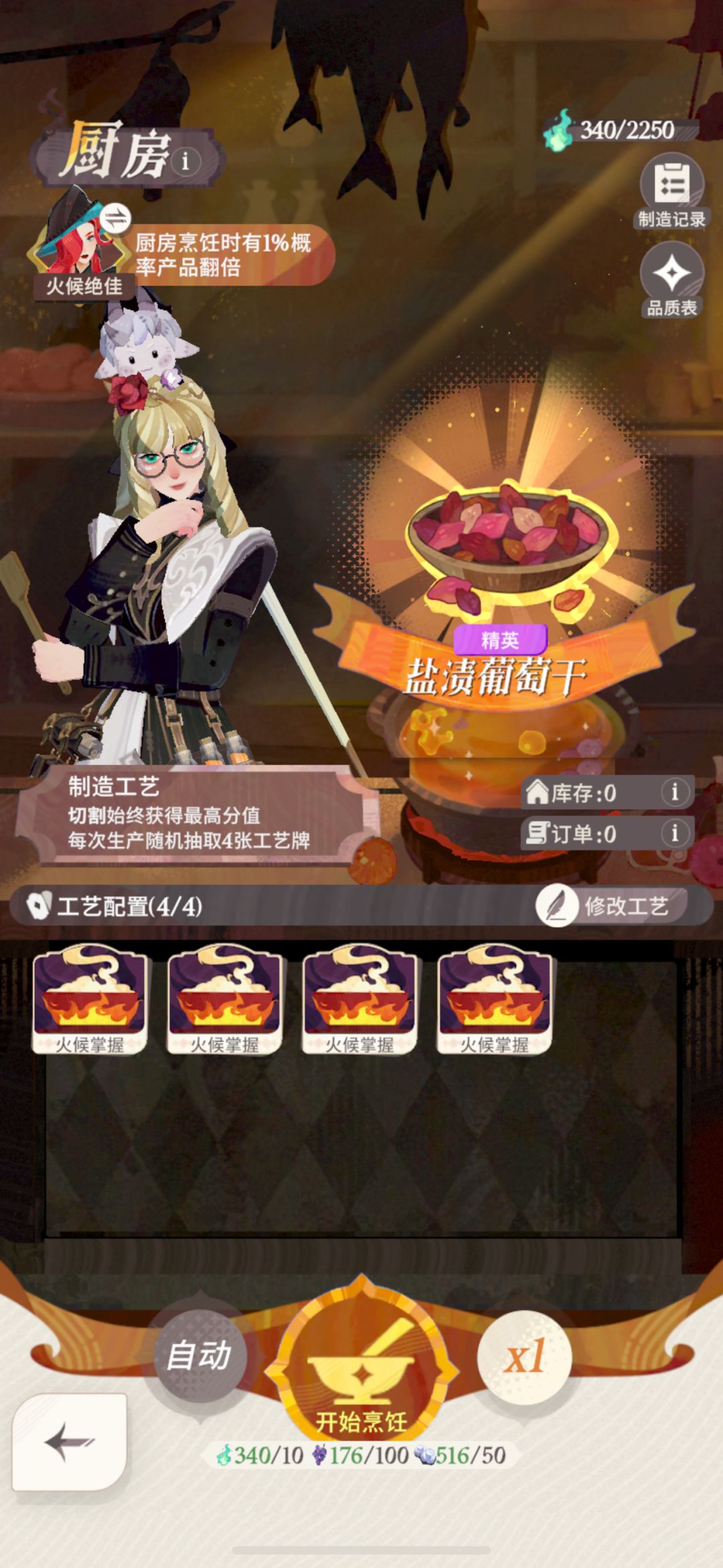 【厨房】8个1星【盐渍葡萄干】,配方【火候掌握,火候掌握,火候掌握,慢炖】→→→【炼金】研磨 Lv3