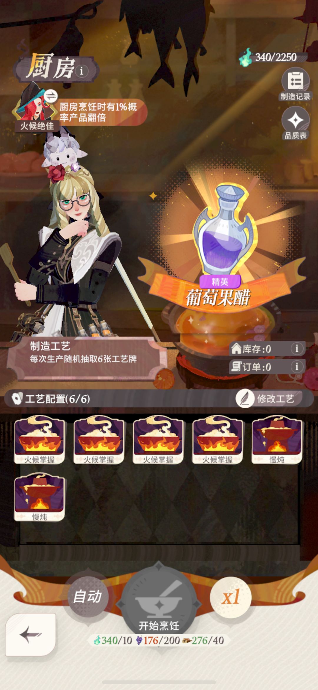 【厨房】8个1星【葡萄果醋】,配方【火候掌握,火候掌握,火候掌握,火候掌握,慢炖,慢炖】→→→【厨房】火候掌握 Lv2
