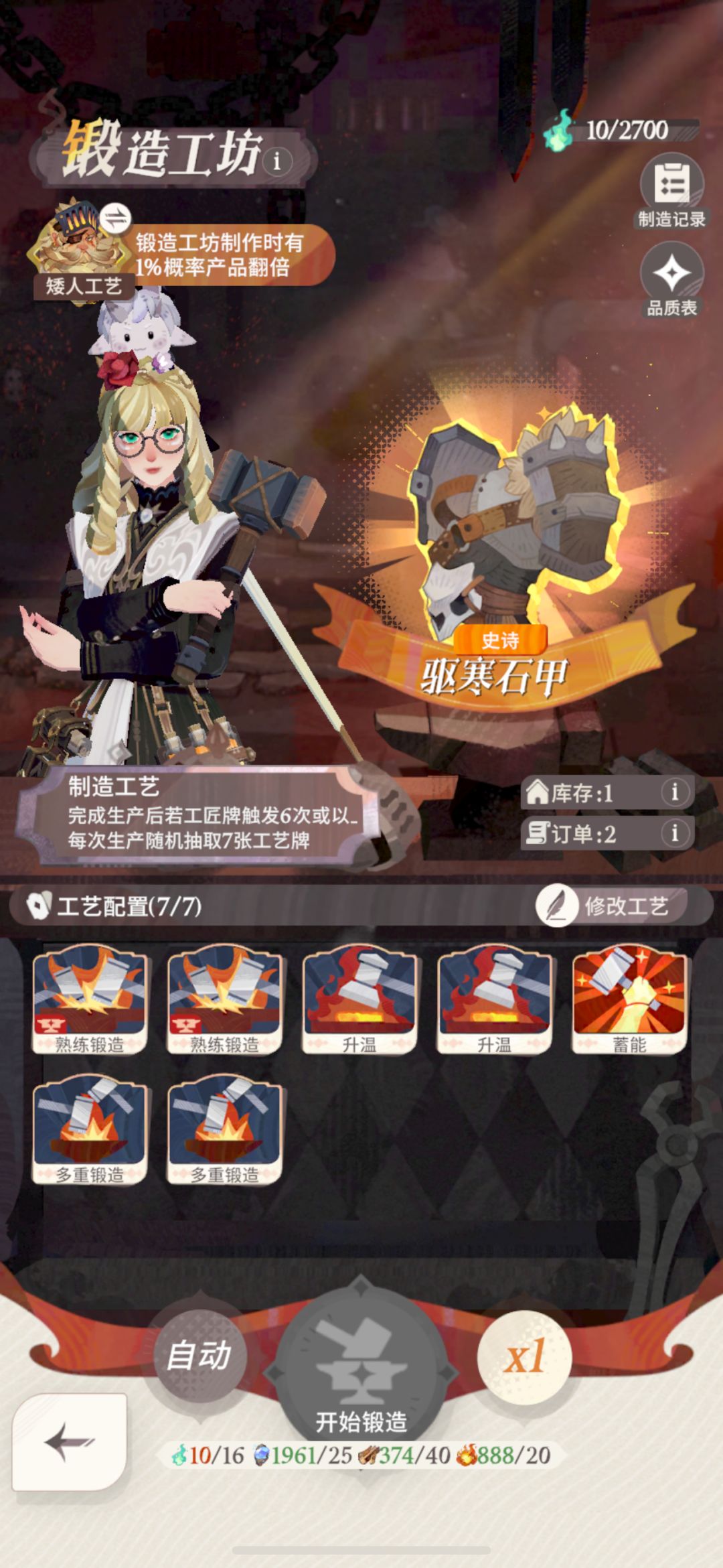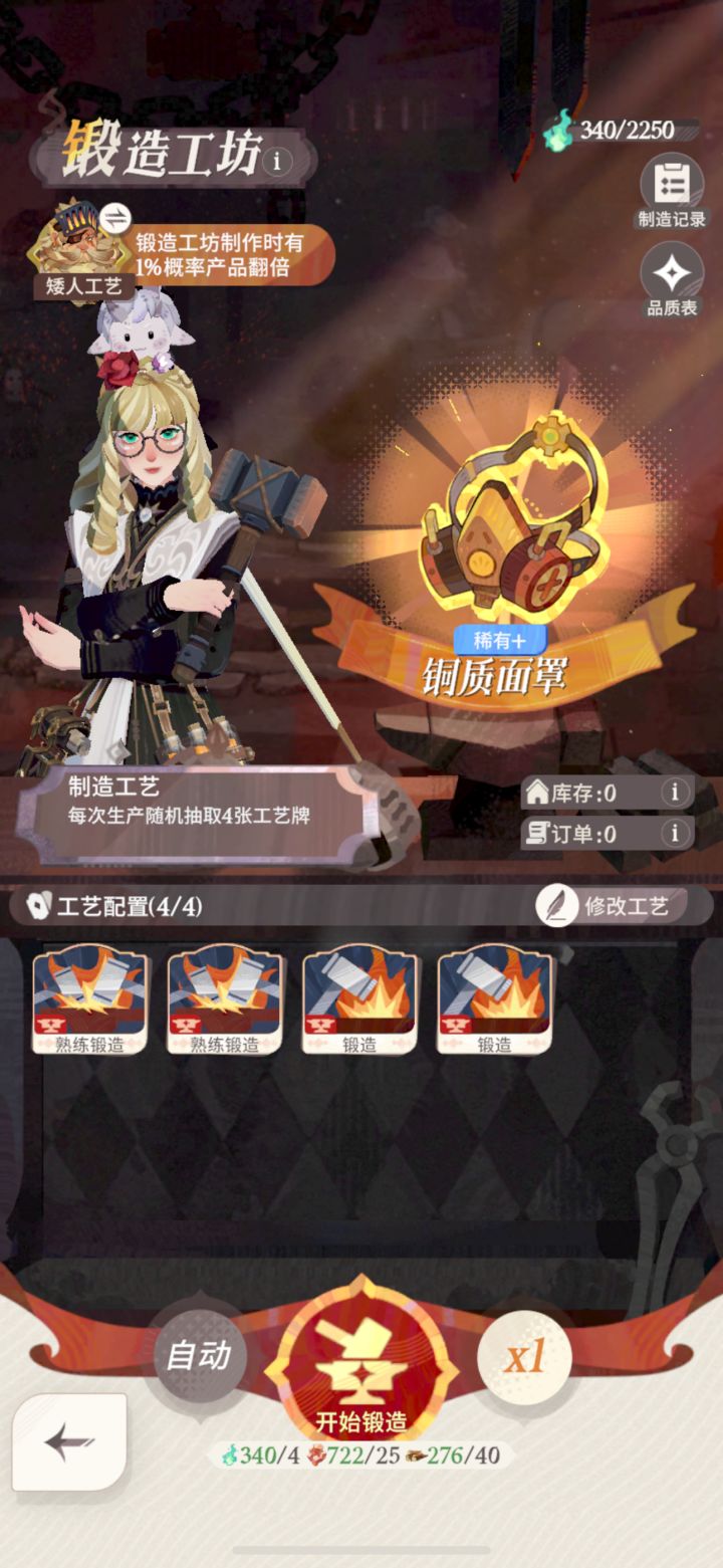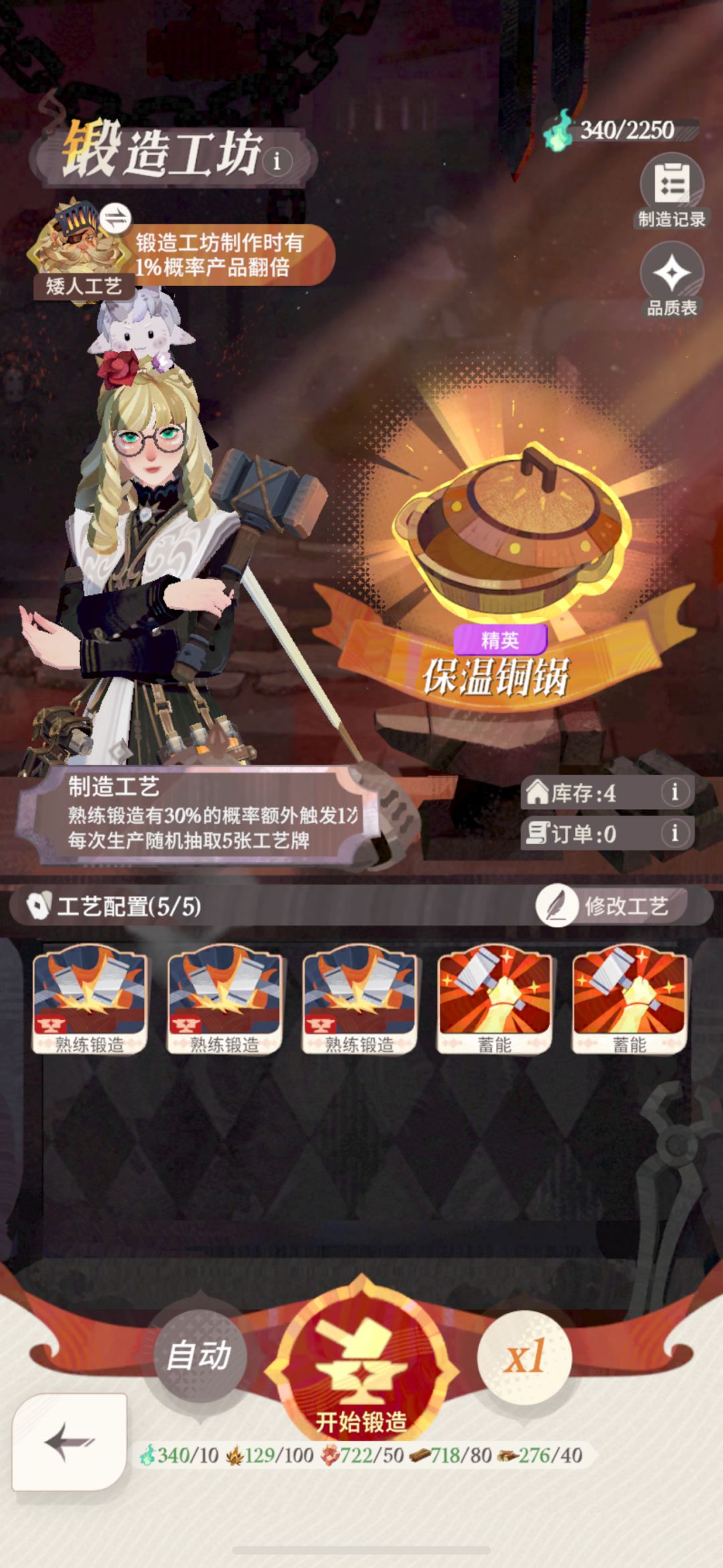 【锻造】8个1星【保温铜锅】,配方【熟练锻造,熟练锻造,熟练锻造,升温,蓄能】→→→【锻造】锻造 Lv4,【厨房】慢炖 Lv2