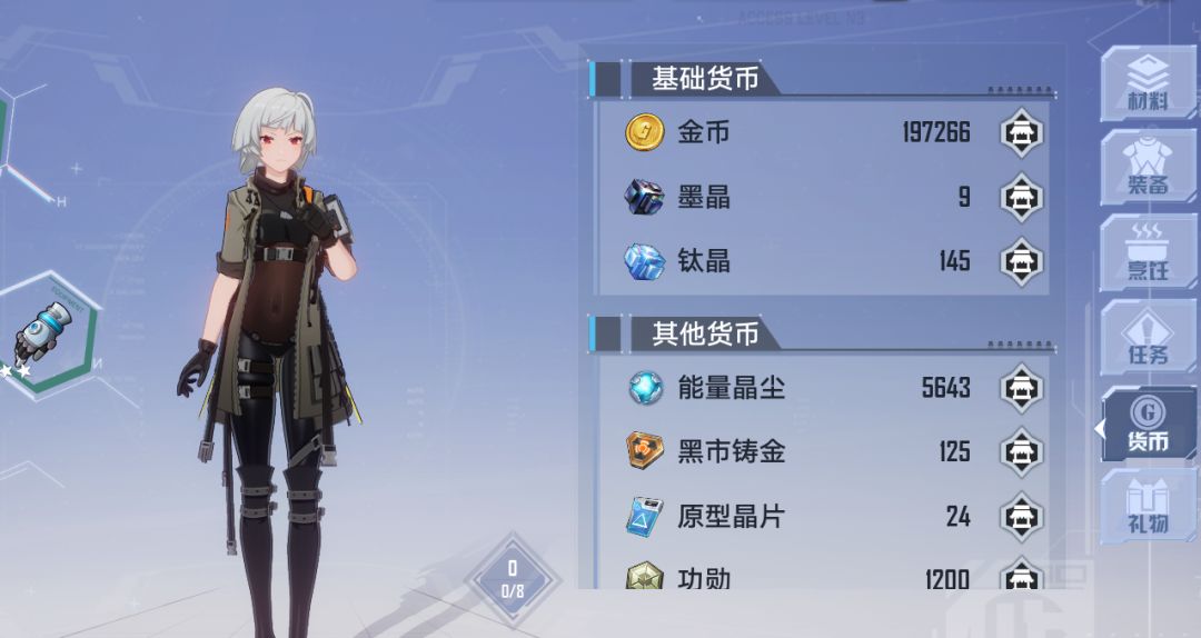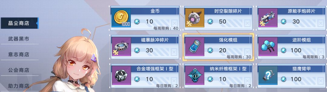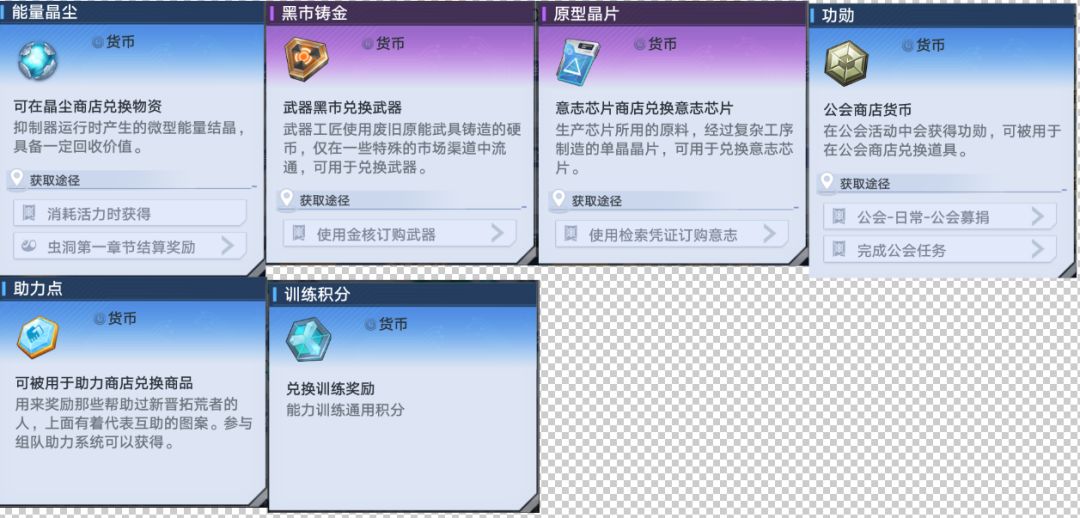 其他货币目前包涵:能量晶尘,黑市铸金,原型晶片,功勋,训练积分,助力点,成就点。