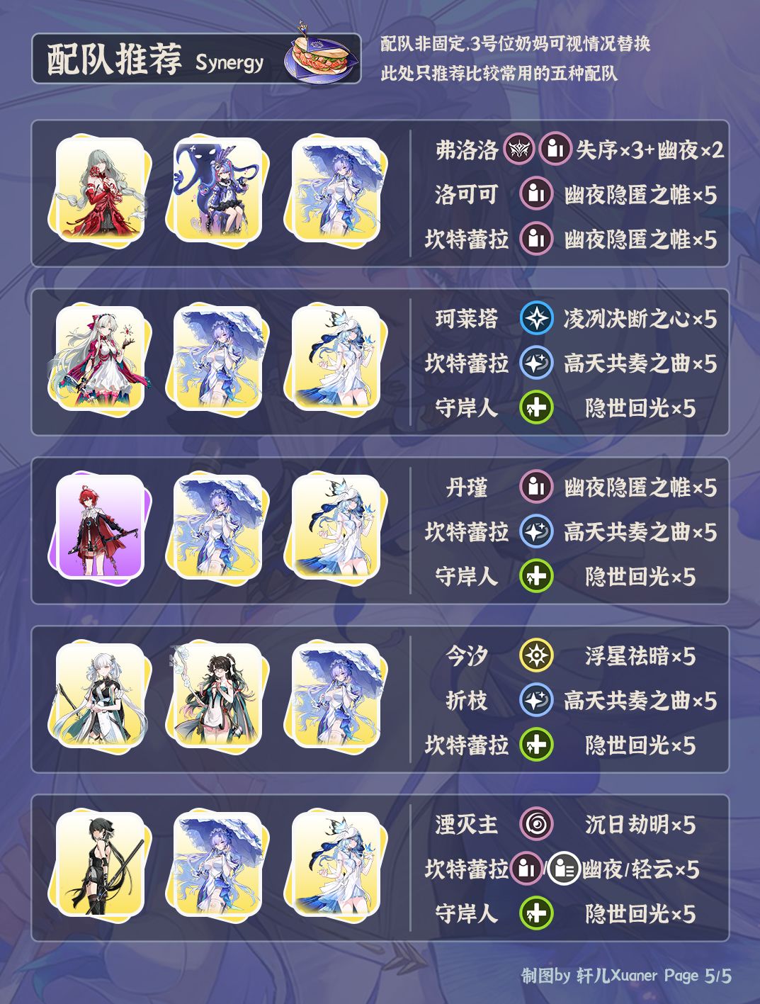 ④ 坎特蕾拉声骸多样,如果在湮灭队一般带幽夜套。在其它属性队伍副C带高天或轻云套。如果做奶妈位,要携带隐世回光。