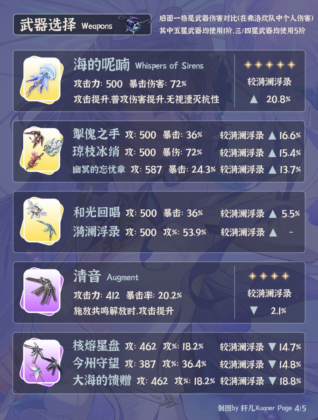 ⑤ 坎特蕾拉使用音感仪,首选专武。本次武器伤害数据是依据在弗洛坎队伍中坎特蕾拉个人伤害计算。很多人会问弗洛洛专武用着如何,计算下来略差于折枝/吟霖的专武,不过也是可以用的。