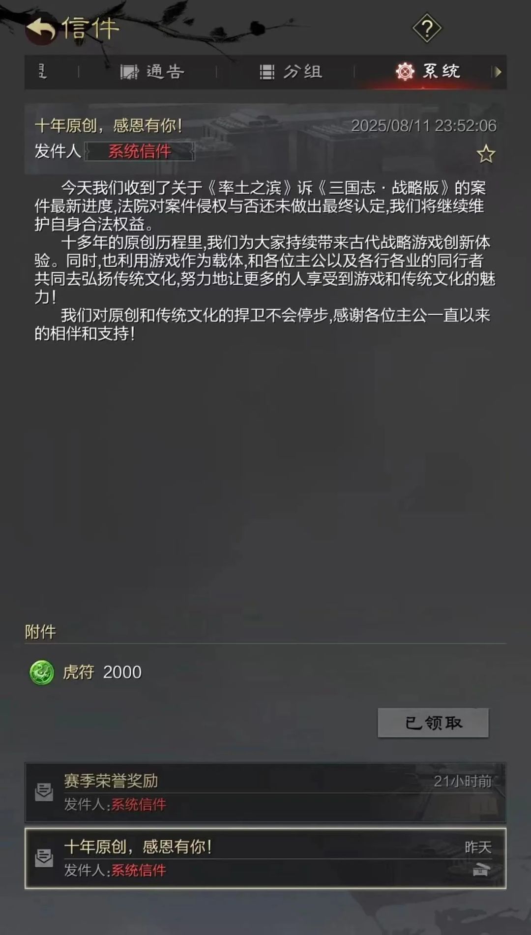 与此同时,《率土》也在8月11日晚间,于游戏中发布公告称:「今天我们收到了关于《率土之滨》诉《三国志·战略版》的案件最新进度,法院对案件侵权与否还未做出最终认定,我们将继续维护自身合法权益」