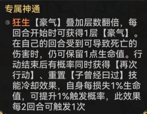 2. 专属神通:“豪气”层数翻倍,每回合开始获 1 层;濒死时留 1 血;行动后概率获“再次行动”+重置“子曾经曰过”冷却(自身每掉 1%血,触发概率+1%,每 2 回合限 1 次 ),生存与输出循环直接拉满!