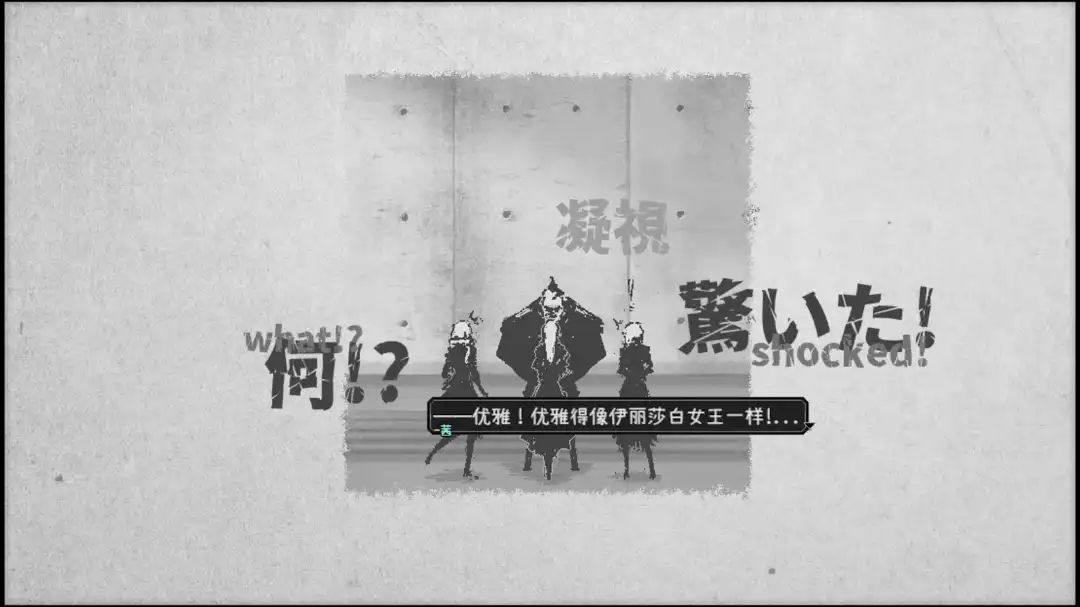 在基于这般画风之上,角色的塑造正是与其相辅相成的东西,主角也是个反差萌,阿不,倒不如说,游戏中的角色个顶个的反差萌,上一秒还在乖乖站好,面对队长的威压吓得说不出话,而下一秒蹦出一句“您的眼睛真漂亮......眉毛锋利又优雅.......向伊丽莎白女王一样”。