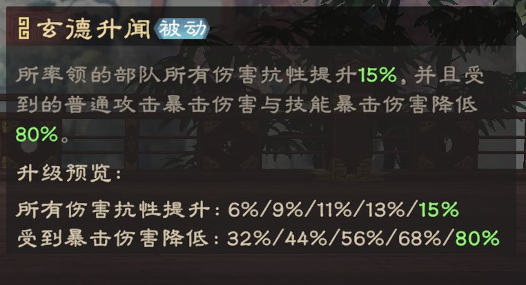 刘备被动“玄德升闻”可提升部队所有伤害抗性,降低队伍受到的普攻、技能造成暴击伤害,可有效克制普攻流、技能流阵容。此外可通过“王霸之略”提升治疗效果,己方武将释放技能时概率使部队进入持续治疗状态。队伍爆发虽然不高,但可以一边输出伤害、一边治疗,可逐步消耗敌方的兵力,从而取得最终胜利。