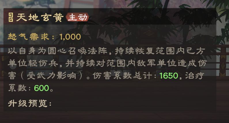 刘备可在中等范围释放主动技,对范围内的敌军造成持续伤害,并且持续治疗己方轻伤单位。由于刘备武力成长稍低,主动技伤害不高,主要是可提供持续治疗、降低战损。