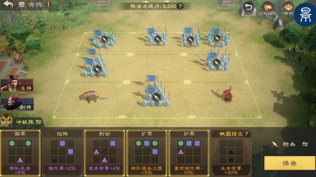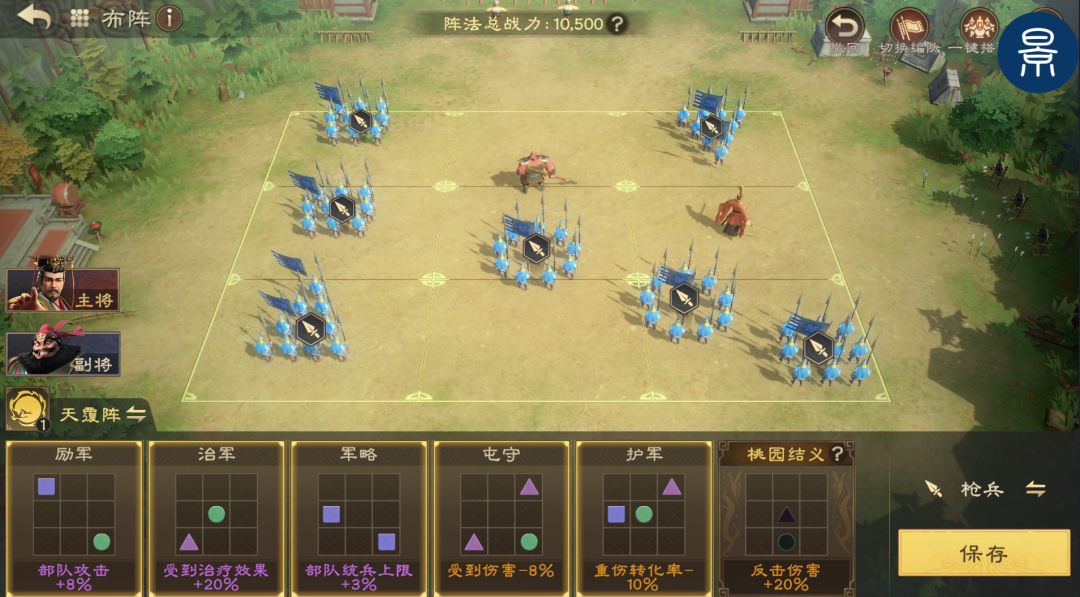 天覆阵在部队释放技能后概率提供治疗,多治疗机制联动,可更好的维持部队兵力稳定,按上图布阵可以同时满足各项阵型、享受多个加成。上图中的桃园结义,要激活相应羁绊才能选择。