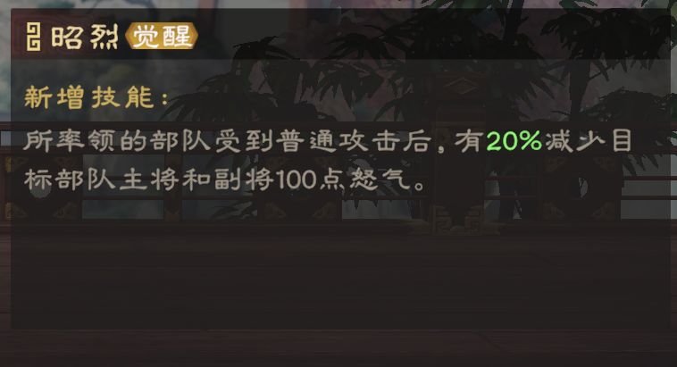 刘备觉醒后受到普攻概率降低目标怒气,敌方攻击频率越高、受到的限制就越大,可克制各类普攻流阵容。