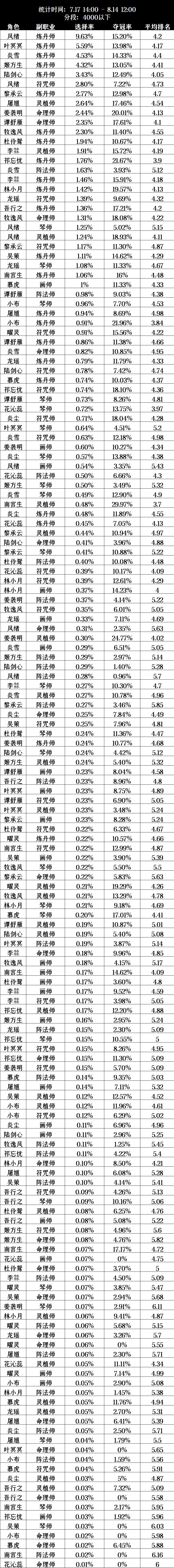 道友们好,本次统计时段为7.17 -8.14,分4000分以上和4000分以下两个统计区间。