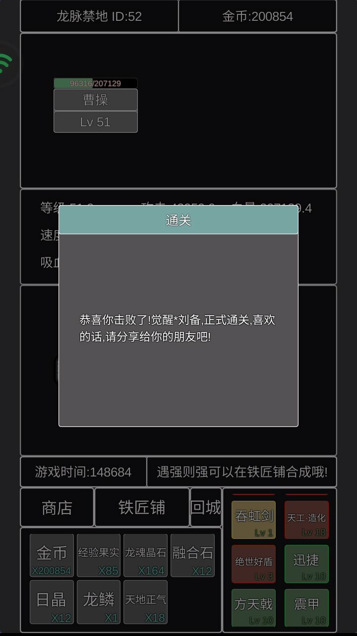 没啥啥说的直接上图,10格装备搭配,已通过刘备。绝世好盾和绝世神盾🛡️各带一个,其他的看着搭配。没合成天工造化前可以先合成俩种类盾牌。那样最后可以留四个位置是选三黄装备配俩绿装,还是俩黄装备配三绿装,我因为先合的天工,少一个格子合不了黄装了,所以只能俩黄装配三绿装了。