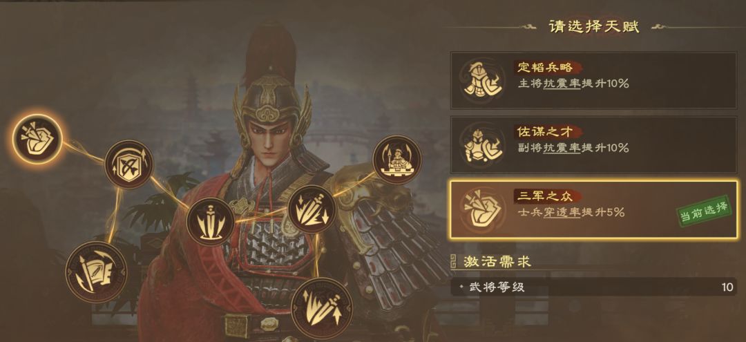 推荐路线:三军之众(提升穿透)→控弦被甲/阵移龙势(弓兵/盾兵提升生命值)→强袭之阵(携带普攻阵法,提升普攻伤害)→一鼓作气(提升普攻伤害)→坚壁清野(提升普攻暴击抗性)/临危不乱(处于异常状态时降低受到伤害)→攻无不克(提升普攻伤害)→50级天赋(基于需求灵活选择)