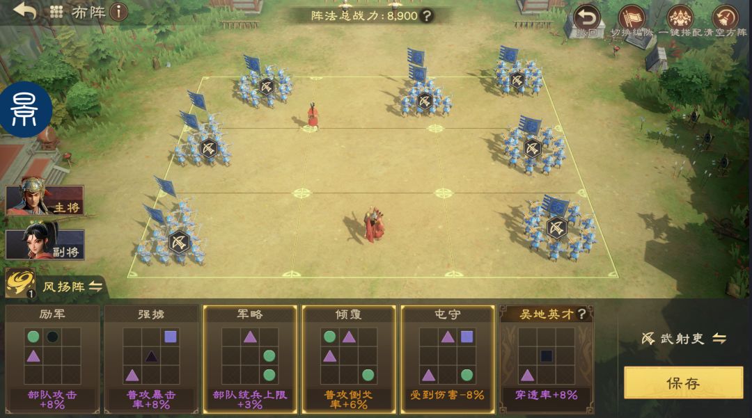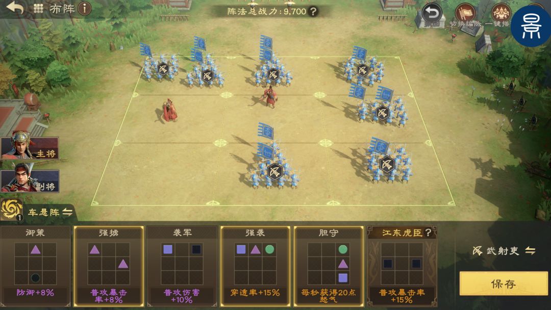 推荐阵法:车悬阵(部队普攻后进入穿甲状态,免疫反击伤害),阵型选择袭军、胆守和强袭。