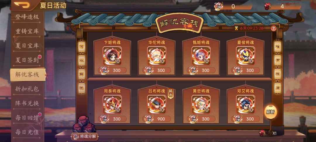 活动内容:活动期间,可通过【武将之魂】兑换将魂,可通过【解忧酒】刷新客栈的将魂,每天有一次免费刷新次数。