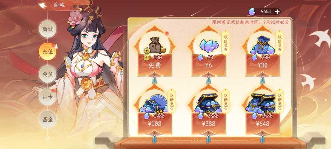 活动内容:活动期间每个充值档位首次充值可领取双倍灵石奖励。