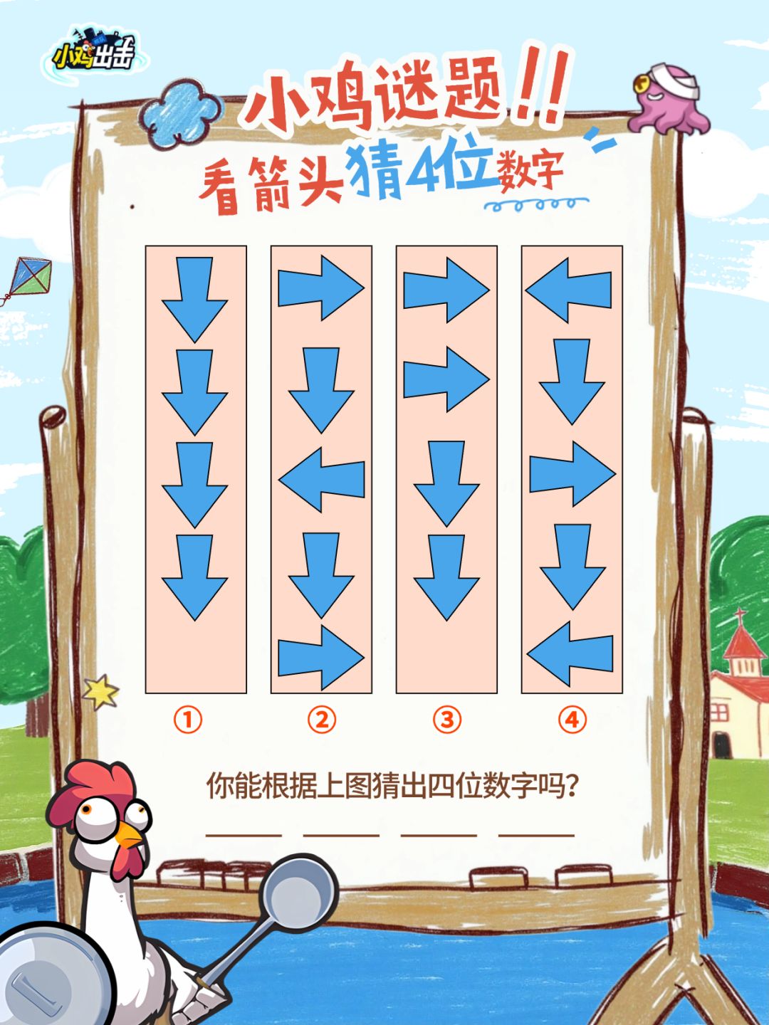 小白给队长们带来了打气好礼!解开谜题就有机会赢京东卡、钻石礼包!队长们能根据下图四列箭头猜出对应的四位数字吗?