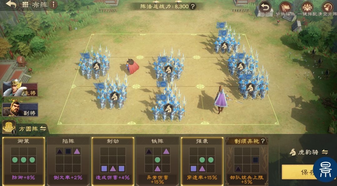 如果想拓宽打击面,可选择方圆阵,在释放技能时概率给目标施加缴械(环境中也有大量的普攻队),阵型选择强袭、制动、御策;如果有割须弃袍,可选择割须弃袍、陷阵。