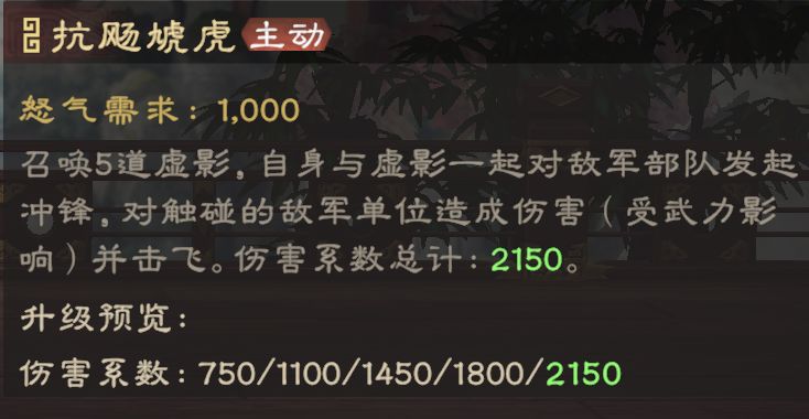 抗飏虓虎可对较大范围的目标造成伤害,怒气技覆盖范围较广,而且最后一段有击飞效果。除了打控制以外,主动技是马超重要的输出来源。