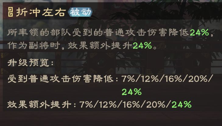 被动在己方武将释放技能时,概率获得“主动技能伤害”抗性的防御效果,可降低队伍受到的主动伤害(而且最多可以叠加3次,减伤效果显著)。在受到普攻时可大幅降低受到的普攻伤害,可专门用来针对普攻流。