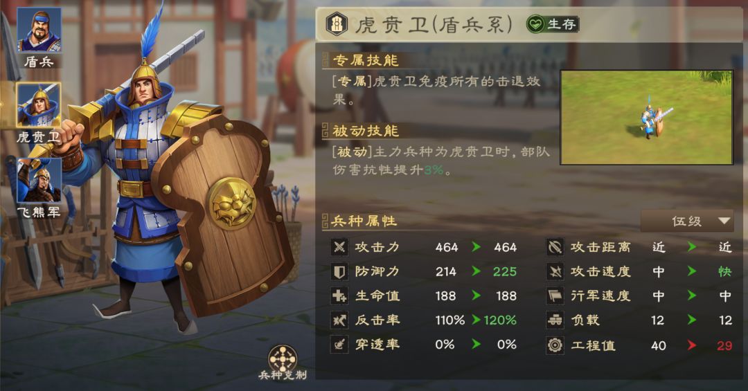 许褚自带出色的减伤、续航优势,虎贲卫可进一步提升伤害抗性,可使队伍的生存、容错进一步提高。虎贲卫免疫击退效果,而且也拥有更高的防御力、反击率,可以更稳定的黏人、打伤害,